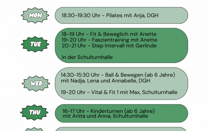 Unsere beliebten Kurse starten in eine neue Runde - Jetzt schnell einsteigen! STEP-INTERVALL mit Gerlinde ...Unser Fatburner Start: Dienstag, 6.01.2026 Zeit: 20.00-21.00 Uhr Ort: Schulturnhalle [...]